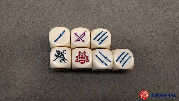 骰子7顆,6面分別為大名、騎兵、弓兵、武士刀(1~3把)