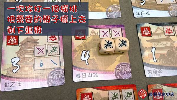 在攻打別人的城堡時,除了原本的條件要被滿足以外,必須再多骰出一個「大名」符號(左上角),成功的話就可以將別人的城池搶奪過來啦
